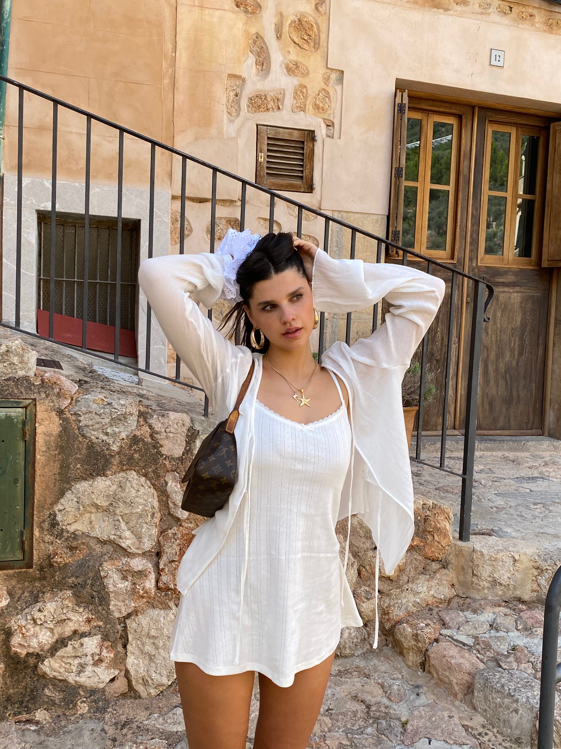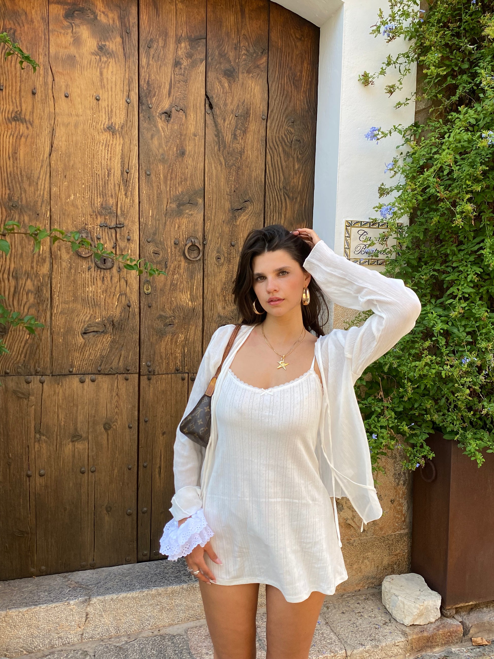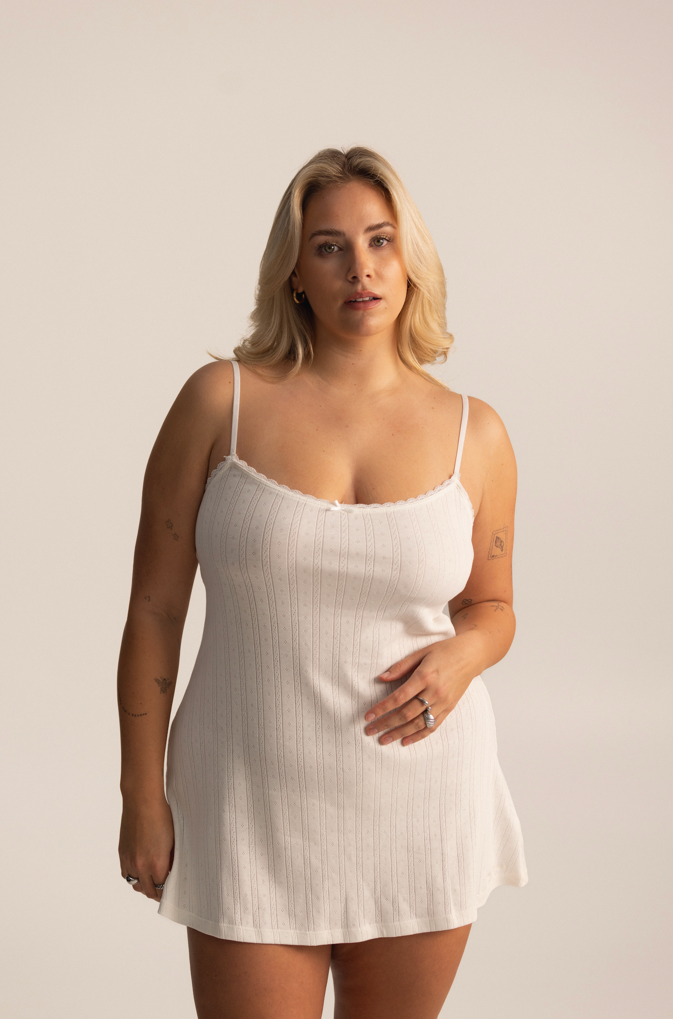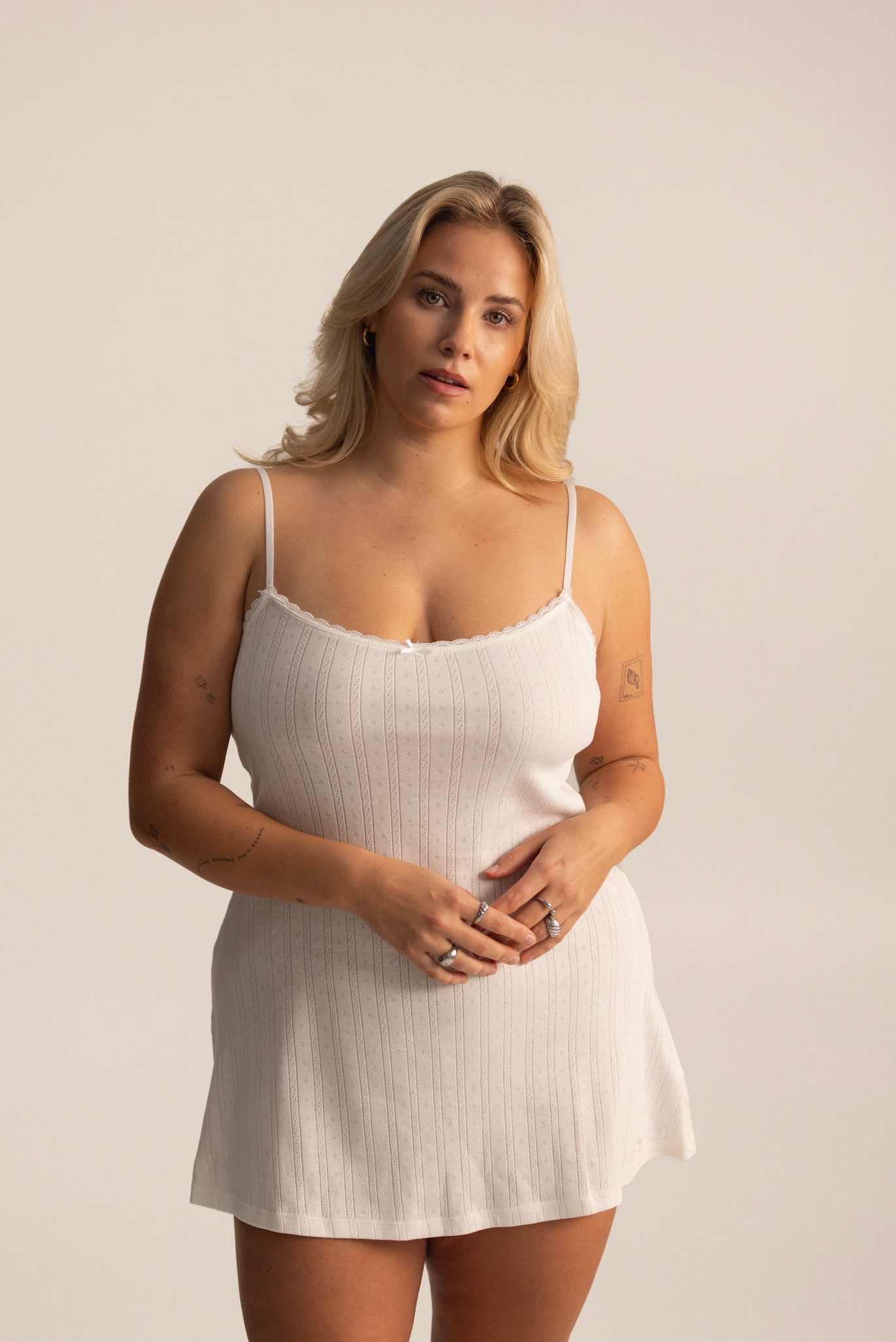 The dreamy mini dress comes in our signature pointelle fabric, which feels natural, cozy, and pleasant on the skin. The fabric consists of 100% organic cotton.