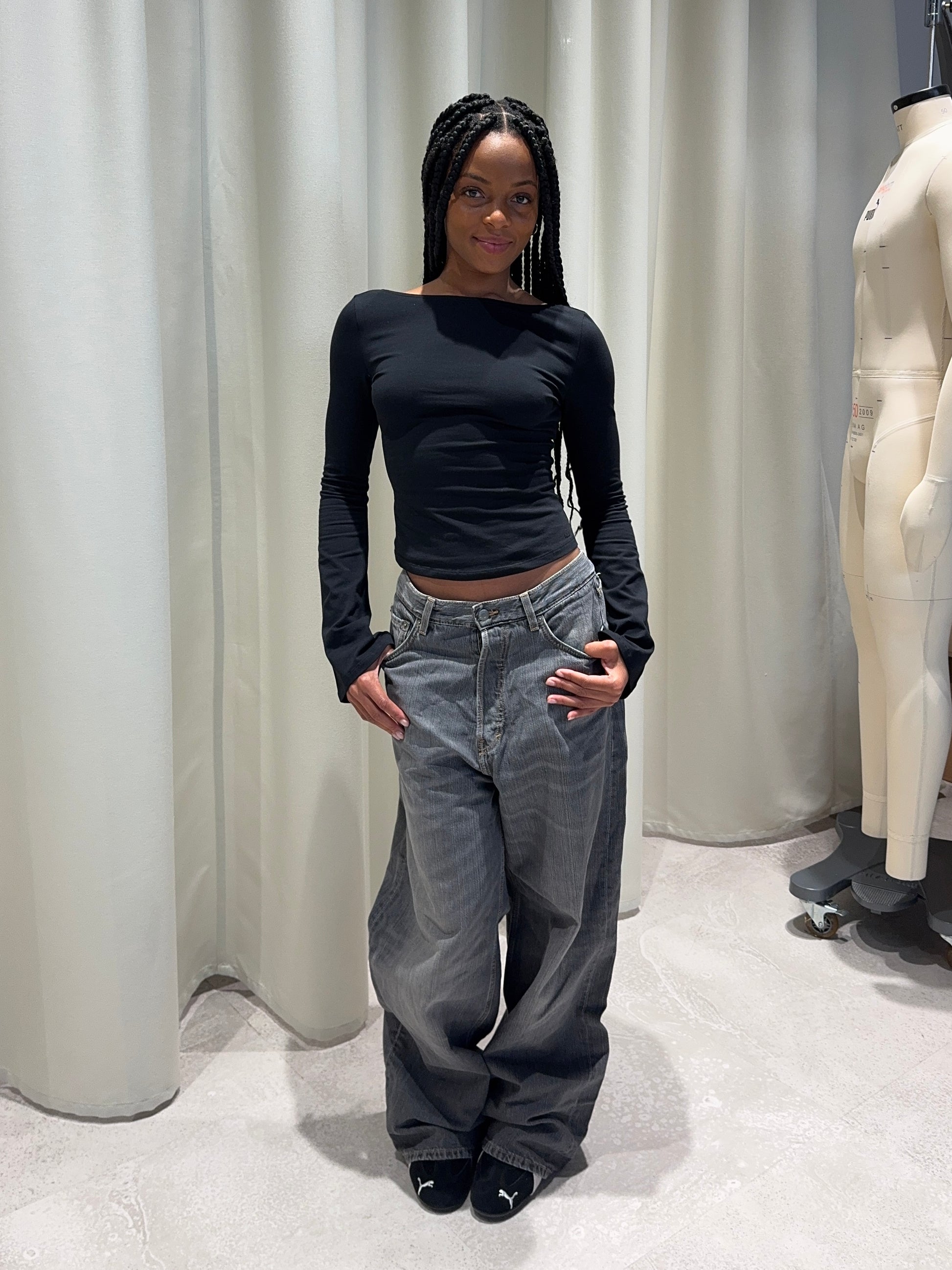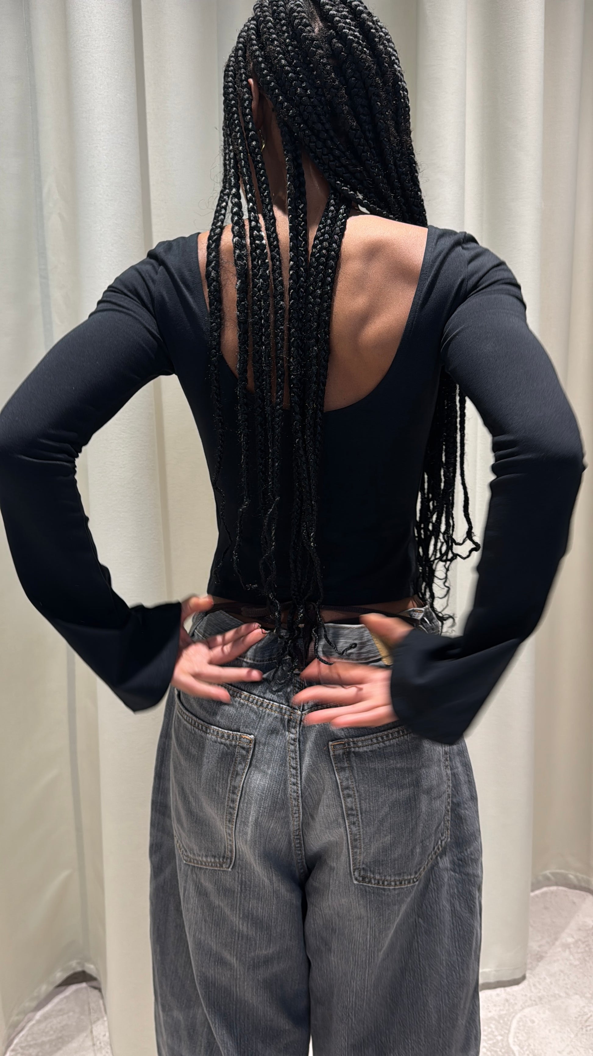 Designed after our soft longsleeve with flared sleeves and a deep back, this style features a daring neckline that’s just low enough to keep it sexy while still letting you wear a bra underneath. The fitted body creates a flawless silhouette, enhanced by our wide neckline, signature curved front hem, and scooped deep back for an extra twist. Flared sleeves at the hem and slightly dropped shoulders complete the cool, effortless look, while the subtle NOM 3D logo adds the final touch.
