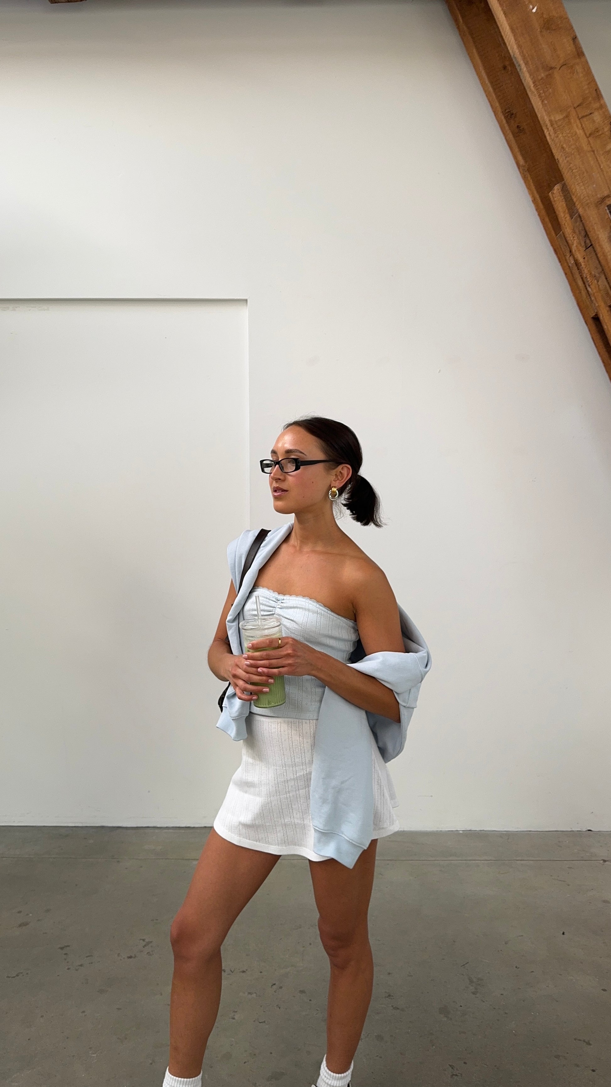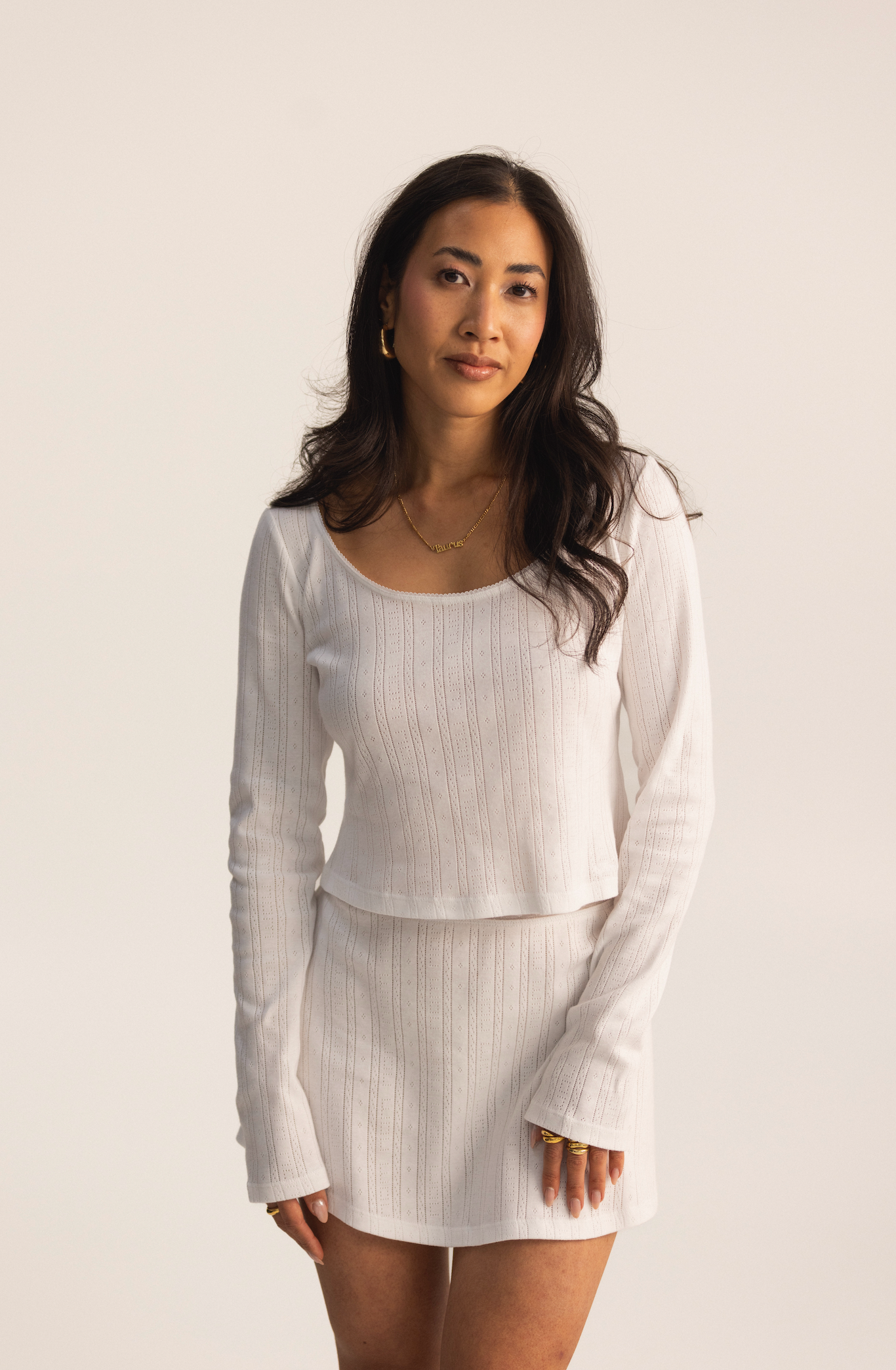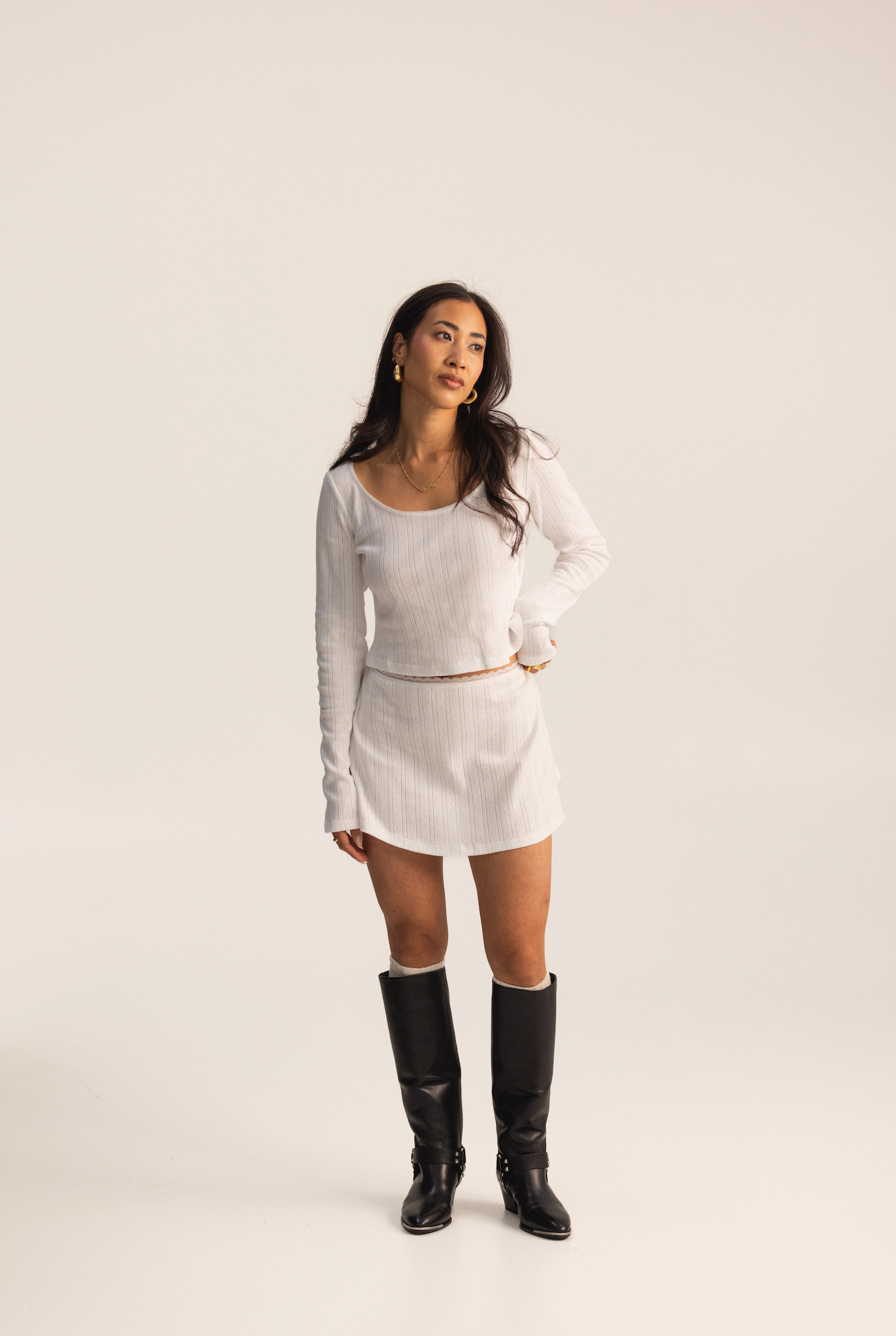 The dreamy mini skirt comes in our signature pointelle fabric, which feels natural, cozy, and pleasant on the skin. The fabric consists of 100% organic cotton.