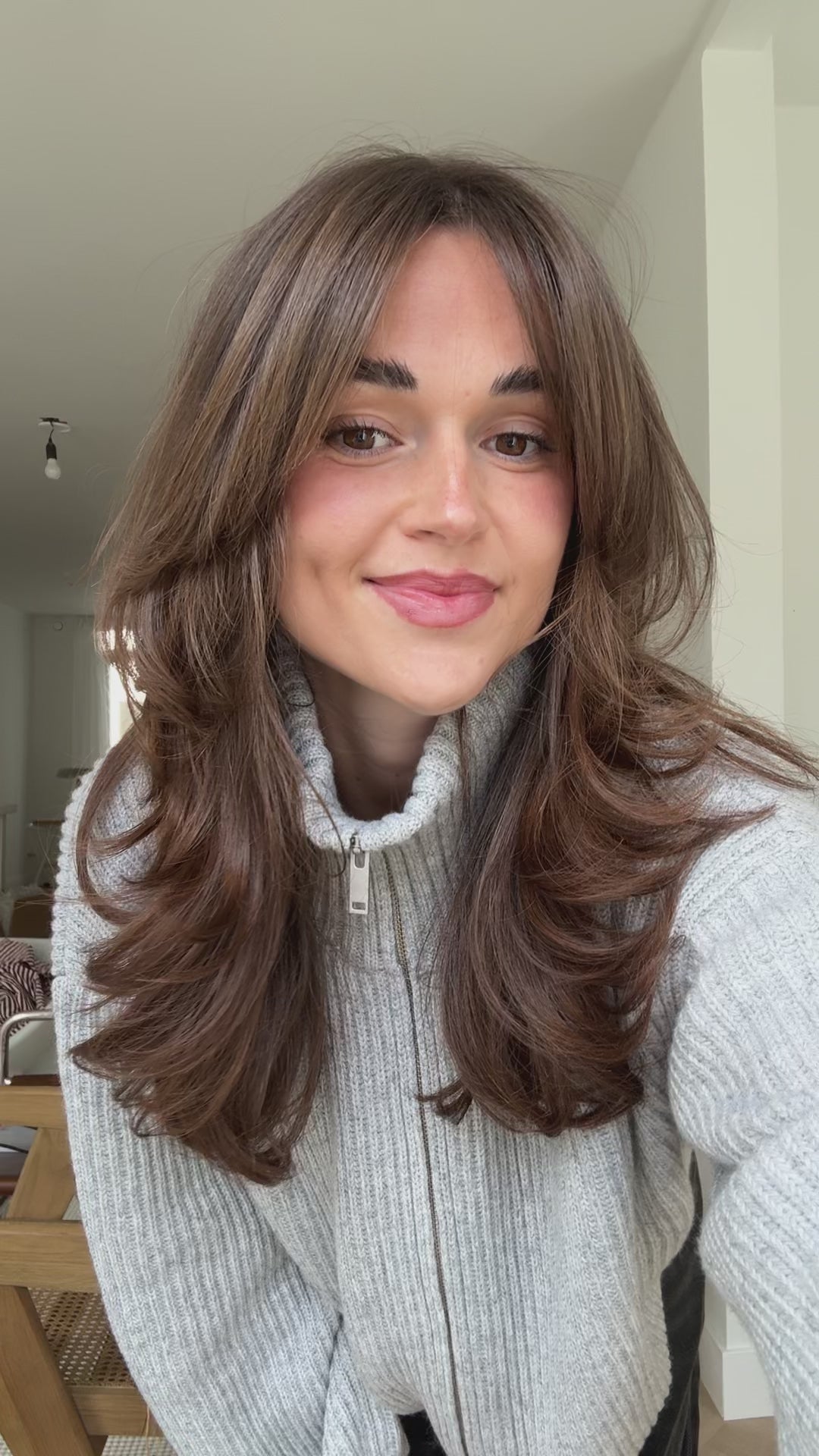 The heavy knit jacket has a compact handfeel and a soft brushed finish. You can easily wear it under a jacket in fall or winter without it being too chunky.